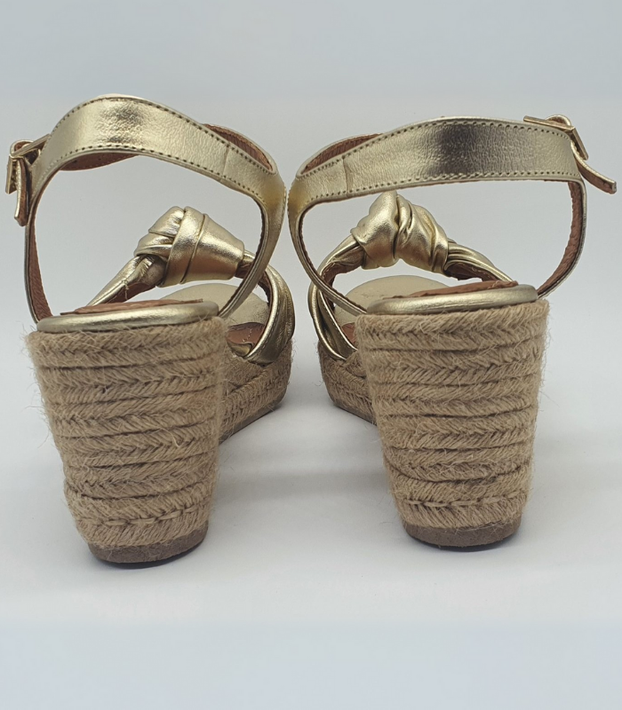 Alpargatas en un elegante tono dorado, que combina detalles artesanales con un brillo suave y sofisticado. Diseñada para mujeres que buscan un estilo atemporal con un sutil toque de luz.