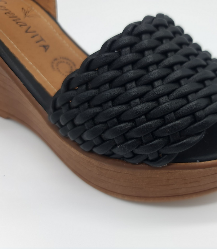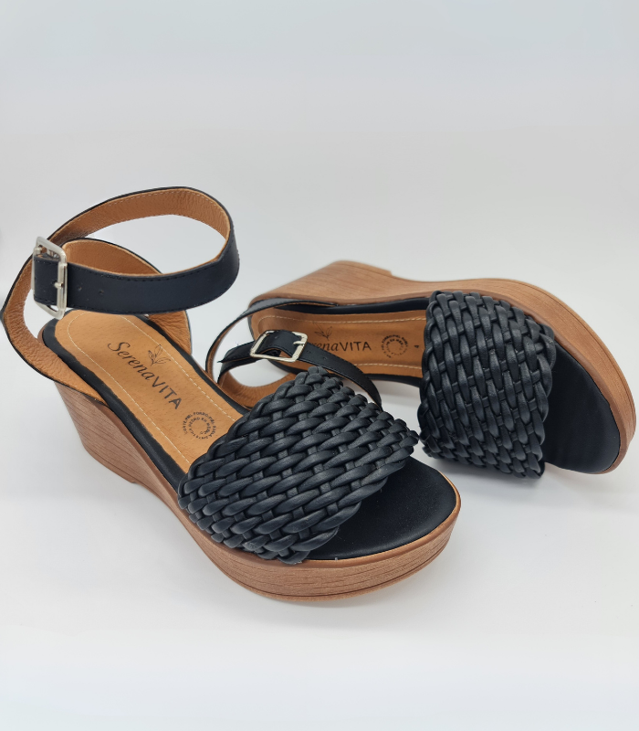 Sandalia de cuña con trenza artesanal en negro profundo. Comodidad que realza tu estilo y apoya la artesanía mexicana.